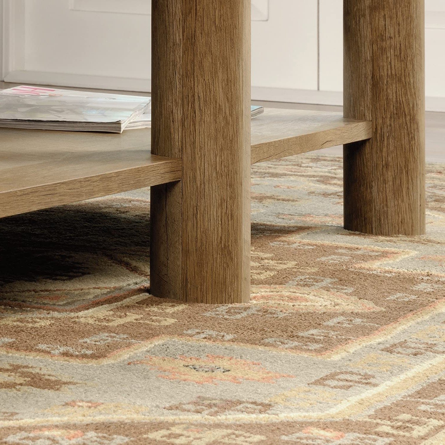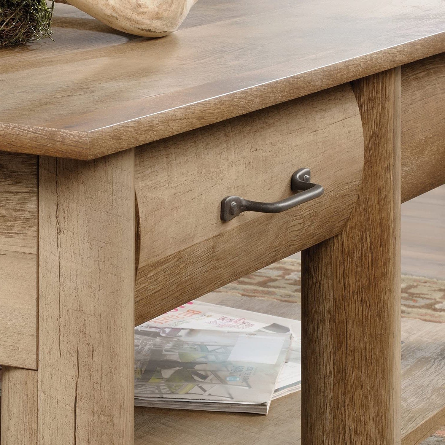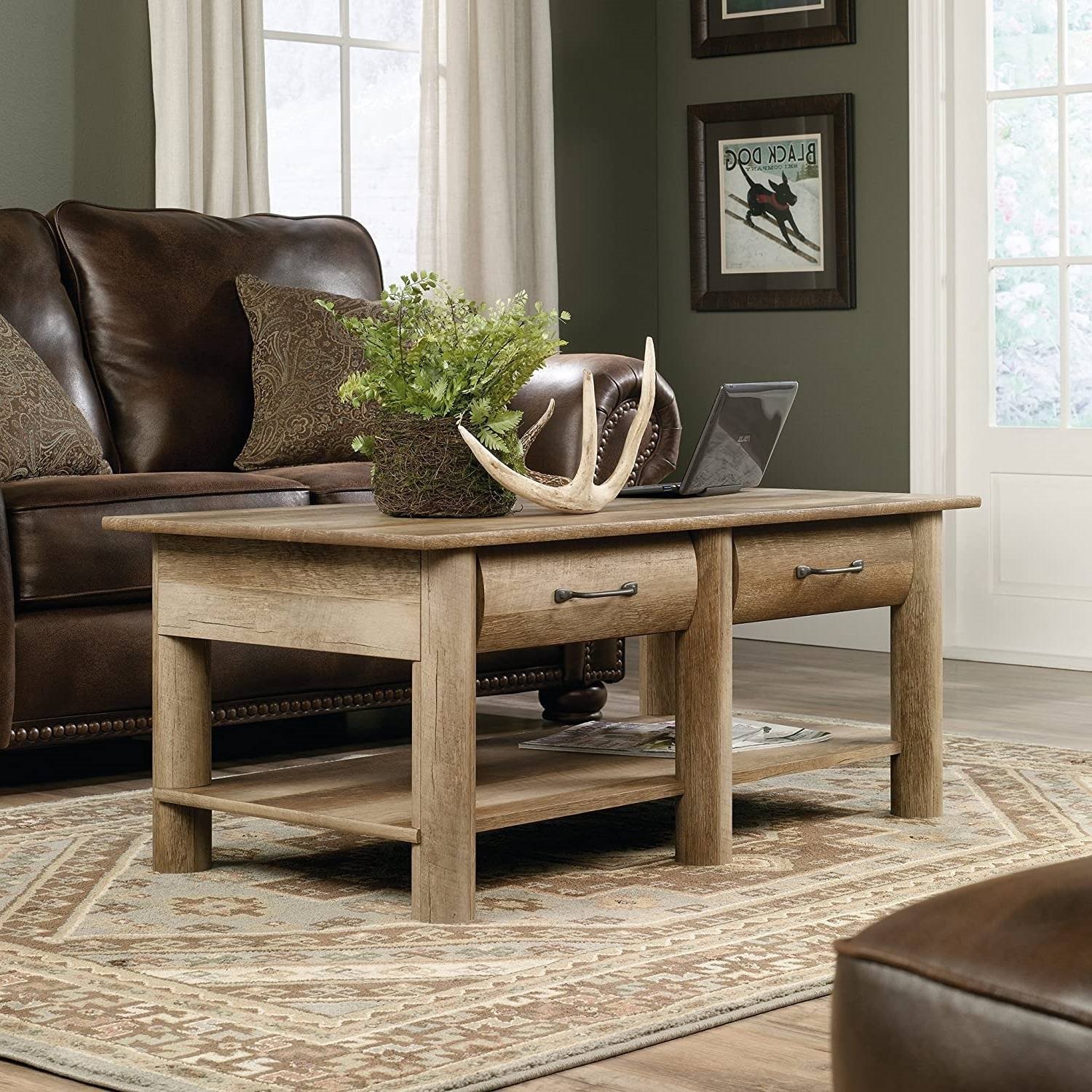 Bring your love of the outdoors right to the center of your living room with this Rustic FarmHome Oak Lodge 2 Drawer Coffee Table. This rustic coffee table offers a spacious top surface that provides you with room for items like magazines, decorative plants, coasters, and your hot cup of joe. Features two drawers that open and close on smooth metal runners for a convenient space to stow away things like the TV remote and your crossword puzzles. This coffee table with storage also feature two faux drawer fronts for an extra touch of detail. This rustic wood coffee table features a sturdy, lodge wood construction. It’s also finished on all sides for versatile placement throughout your home.