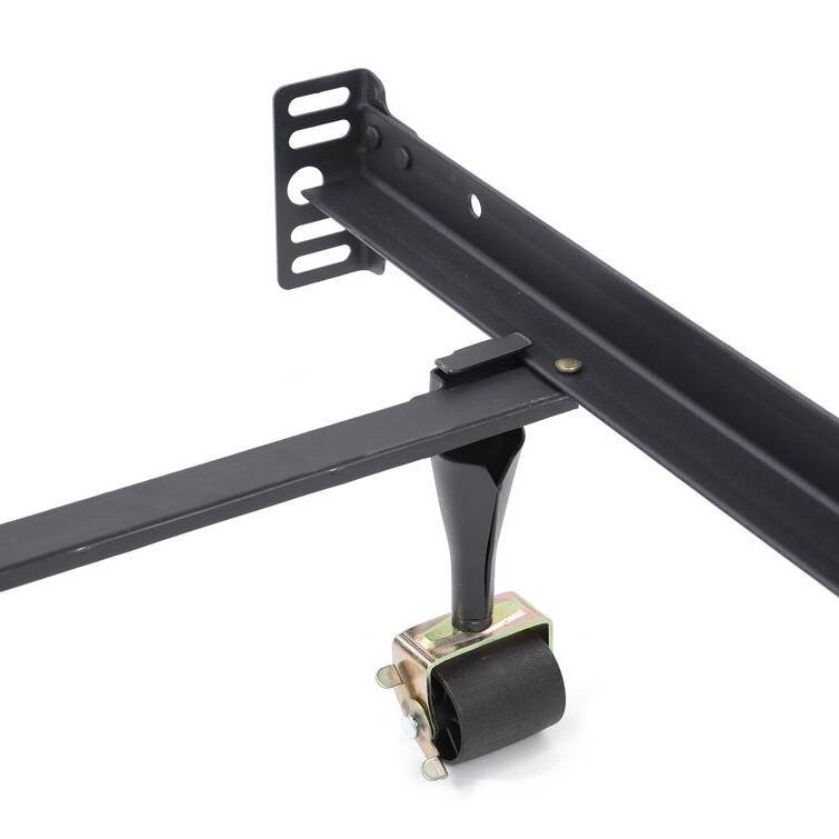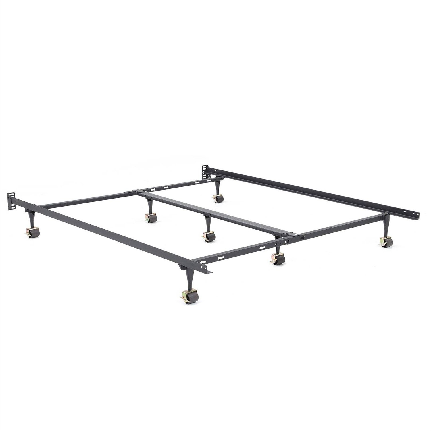 This Universal size Heavy Duty 7-Leg Metal Bed Frame with Locking Rug Roller Casters Wheels has Double Center Support Bar and 7 Rug Rollers with Locking Wheels fits size Twin, Twin XL, Full, Full XL, Queen, King and Cal King Size mattress sets. This solid black matte powder coated steel bed frame is engineered to support heavier mattress sets and feature adjustable sliding end rails. The extra-strength double rail center support bar adds extra support to your mattress and box spring in the middle to prevent sagging. Many manufacturers warranties require a center support frame. The center bar is extra wide at 2 ¼ Inch-for extra stability. 7 rug rollers make moving the mattress easy and all of the wheels lock into place to prevent further movement. The sturdy side rails keep your box spring in place so it cannot shift during use. Headboard Brackets attach to any headboard and screws that attach the bed frame to headboard are not included. Interlocking frame is easy to assemble in minutes and no additional tools are required. An additional extender bar is included for the King and California King sizes.